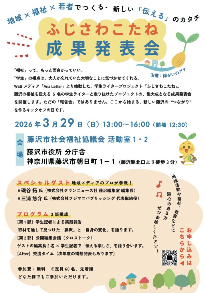 「障がいのアナ」が運営しているウェブメディア「Ana Letter」にて行われている、学生が藤沢市内の福祉的活動に、取材を通して出会い、それぞれの気づきや想いをアナレポで発信していく『ふじさわこたね〜学生がまちの福祉に出会うアナレポプロジェクト〜』。