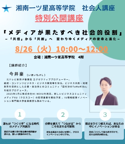 今回は、夏休み期間ということで、保護者や地域の中学生にも参加してもらえる「特別公開講座」と銘打ち、元テレビ東京IP事業局 エグゼクティブプロデューサーであり、一ツ星の地域創成活動に1年近くかかわっていただいた、株式会社HI-NEXU 代表取締役CEO 今井豪氏にお話を伺いました。(今井氏と一ツ星との活動の様子はこちらをご覧ください。)