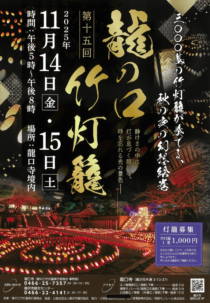 毎年11月江の島の龍口寺で行われる龍の口竹灯籠。江の島の夜が幻想的な灯りで灯されます。