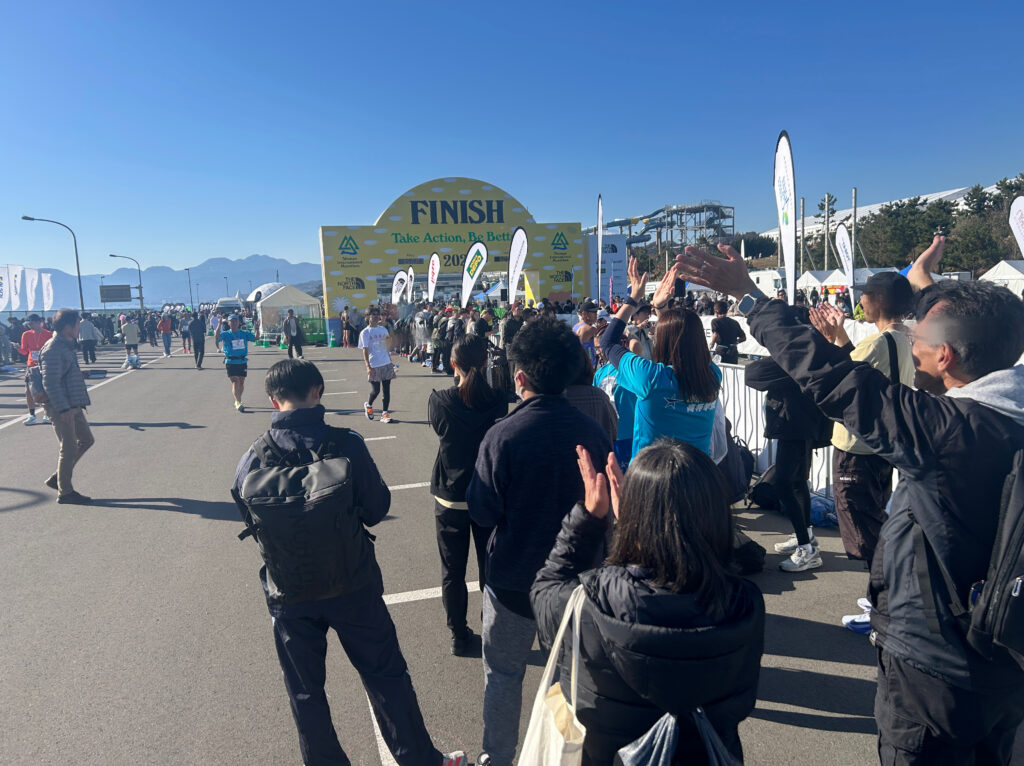 だんだん足が重くなり、スピードも落ちてきます。最大の難関は残り2㎞のゆるやかな上り坂。しかしそこを越えると目の前に広がる雄大な富士山がみんなを待っています!この景色でパワーチャージしゴールを目指します。