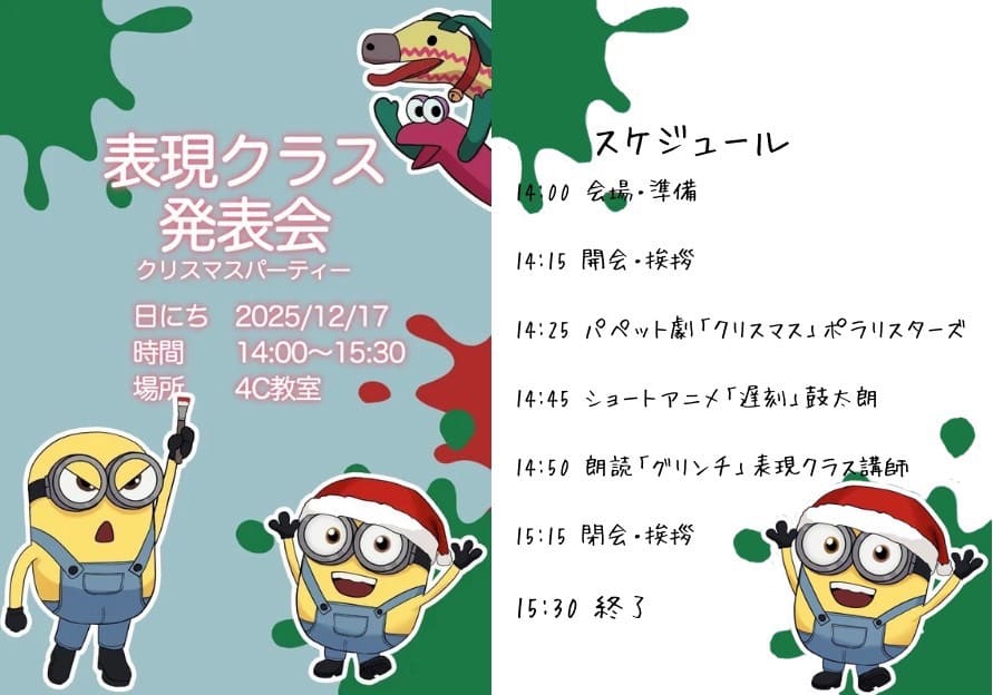 1年間の総まとめとして、表現クラスでは、夏に続き、冬の発表会&クリスマスパーティを開催しました。