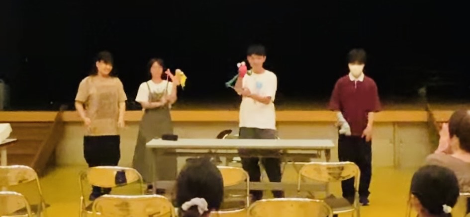 今回は1学期に行った生徒たちの自主的な取り組みを中心に発表しました。まず、パペット作りが好き!と言う新一年生の生徒が仲間を募り、パペット作りやパペットを使ったお芝居を考えるところをキッカケとして発表の準備が始まりました。