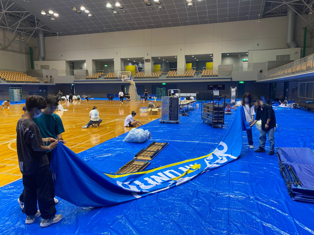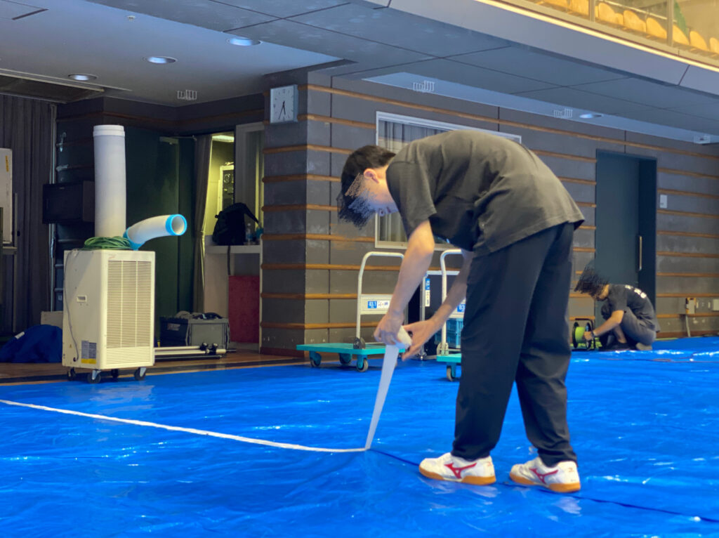 試合前の会場設営の様子。チームスタッフやほかのボランティアさんと一緒に準備をしていきます。
