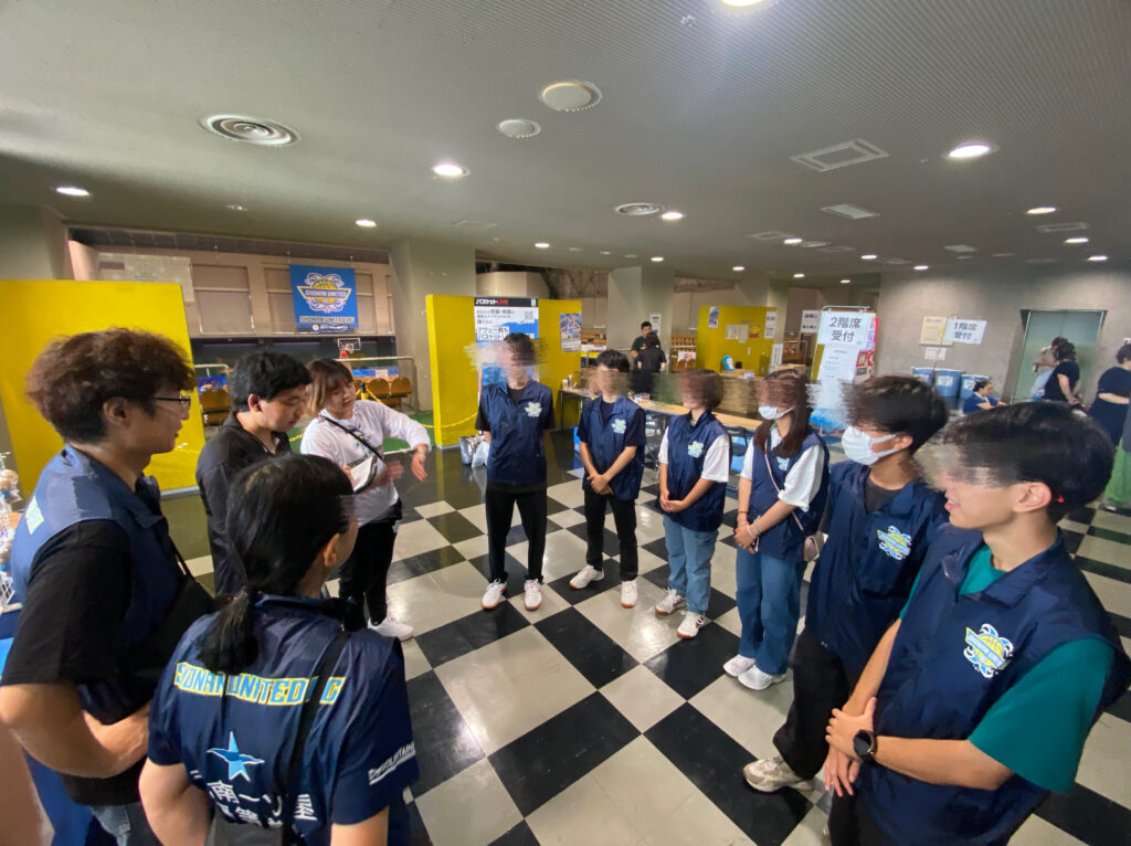 いよいよ、試合当日。さまざまな場所で、ボランティアスタッフとして活動しています。打ち合わせで、動きを確認。
