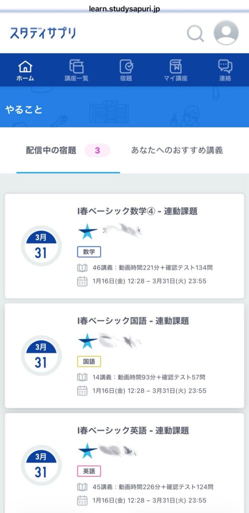 専願合格をした中3生対象の入学前活動の1つ、「教科学習」ですが、その第二弾を実施しました。昨年末に「到達度診断テスト」を実施しており、今回はその結果をふまえたフィードバックです。事前の到達度診断テストの内容をふまえて、単元ごとにどのレベルの講座を、どの順番で復習していけばよいのか、生徒一人一人に合わせて学院から宿題動画を配信しています。今回はその様子と流れをご紹介します。